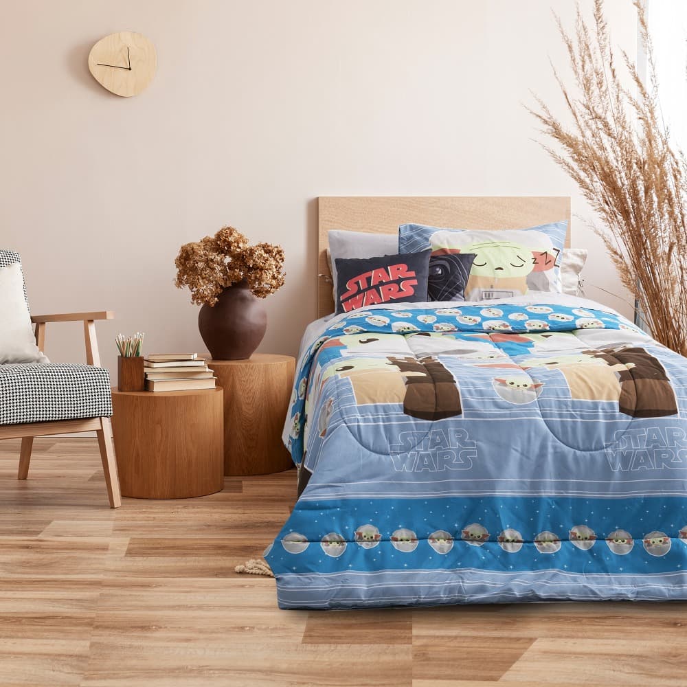 ¡Viaja a una galaxia muy, muy lejana con el Plumón 1.5 Plazas Star Wars Mandalorian Blue! Perfecto para los fanáticos de Star Wars, este plumón transforma cualquier dormitorio en un escenario épico de aventuras intergalácticas.