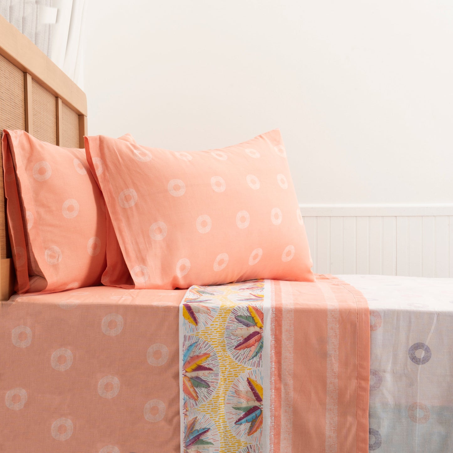 Set de sábanas con delicados estampados. Nuestros diseños tienen un alto desarrollo, donde los bordes juegan un papel protagónico al armar tu cama. Combinalos con plumones o quilt de colores sólidos para darles el lugar que se merecen.
