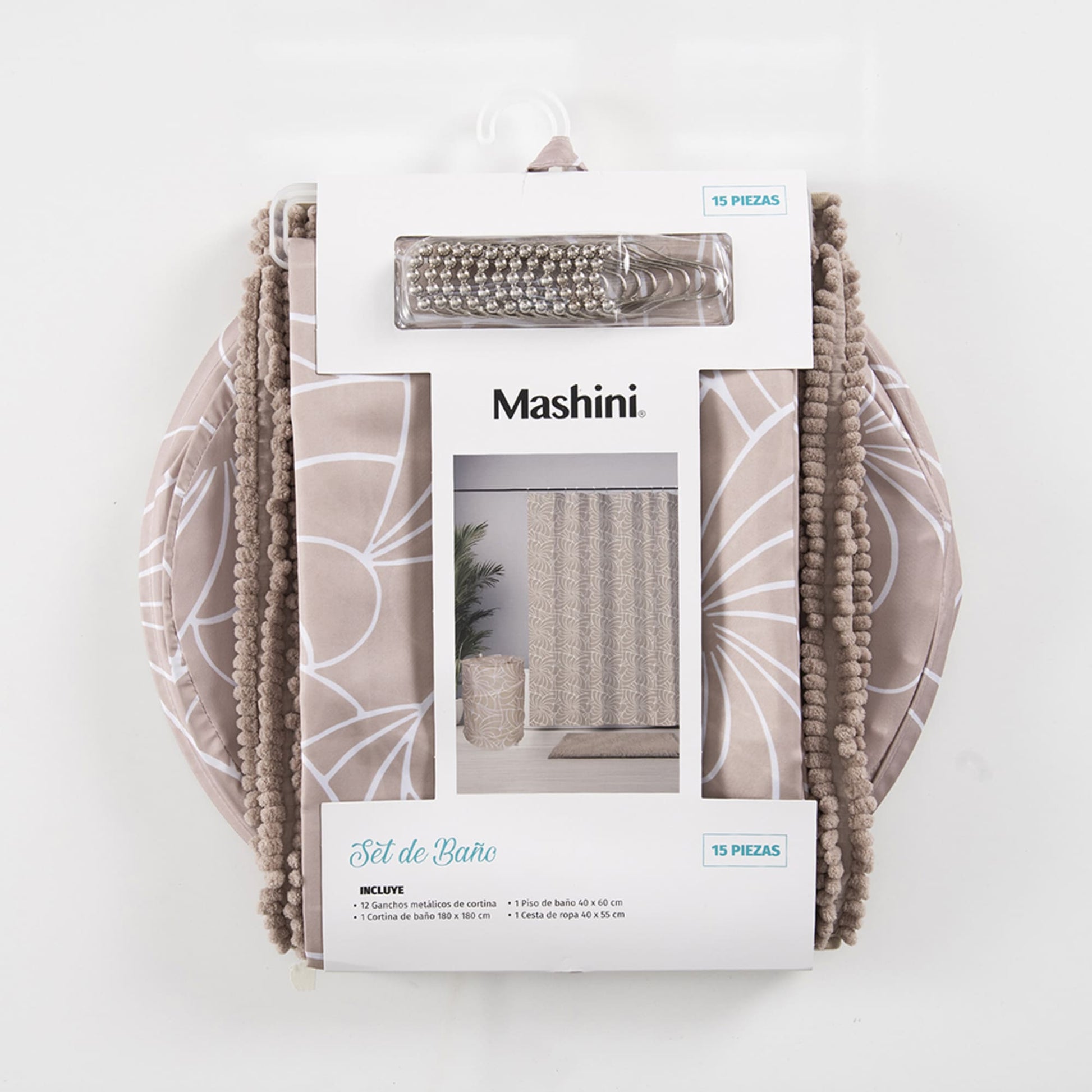 1 Cortina de Baño, 12 Ganchos, 1 Piso de Baño, 1 Cesta de Ropa |